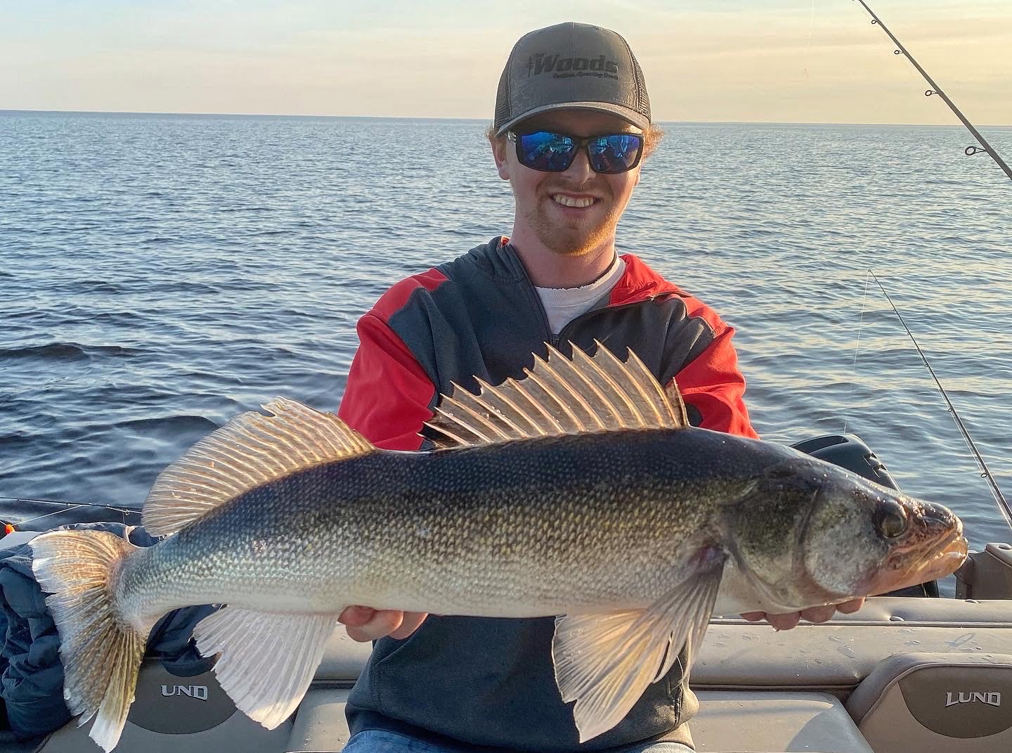 Sunday was a productive day for Austin, finding fish schooled up off of mid-lake structure. Slowly driving around, looking for fish with electronics, and then anchoring up and vertically jigging was by far the most productive strategy. Most of the fish were in 26 feet of water. Gold and blue jigs, with frozen shiners, were the most effective.