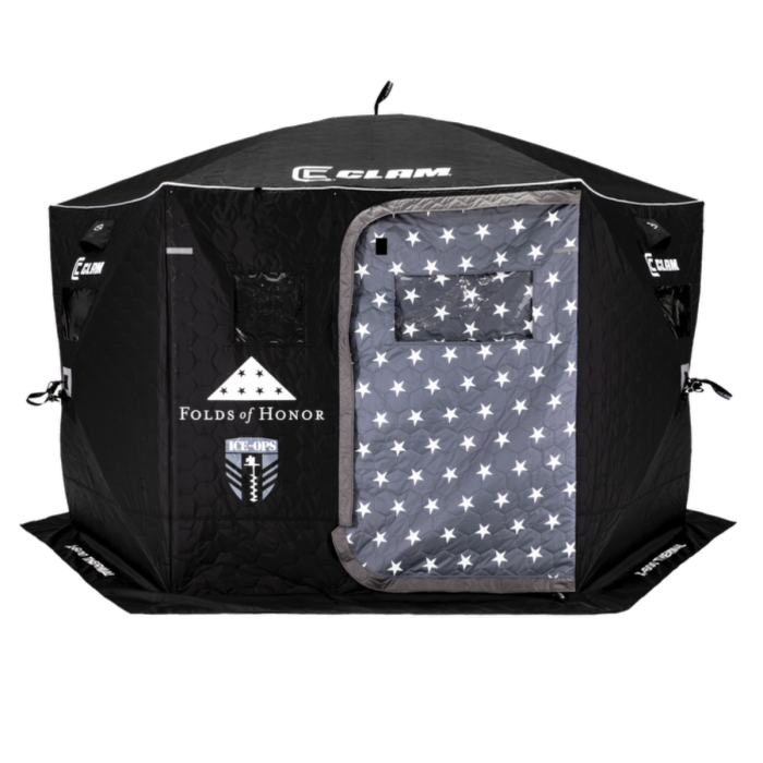The Clam X-600 Thermal Hub is the perfect portable ice shelter for a group of buddies or a day on the ice with friends and family! With unmatched durability, strength, and ease of use, it’s the perfect pop-up ice fishing shelter for those that want to spend their time on the ice fishing in comfort. Featuring the Max Entry door system, ample space for multiple ice anglers and the top components ice anglers are looking for. The Ice Ops Edition of this hub shelter features sewn in rod holders and is a great option for spearfishing or sight fishing because of its black exterior and interior fabric. A portion of the proceeds from this shelter also go to benefit Folds of Honor Foundation!